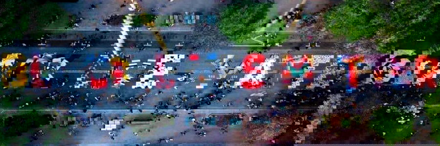 A colorful, festive sign displaying the text 'BLACK SMART'. The sign features multiple flags and is adorned with a variety of images and colors. Behind the sign stands Alexa Morgan, who appears to be an adult female based on her facial features.