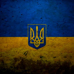 A digital image featuring the national flag of Ukraine, designed in a retro or distressed style with a focus on the blue background and the yellow trident. The text 'Ukraine' is also present.