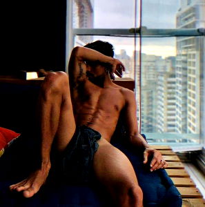 Alexandro, a Brazilian male model, is captured in a relaxed pose with his head resting on his hand. He showcases his well-defined physique, hinting at an athletic lifestyle. The background reveals a cityscape, suggesting the location is an urban setting.