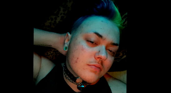 Alex, a model from Alberta, Canada, is captured in a relaxed pose. The image has a strong composition with good lighting and a neutral background that doesn't distract from the model. A hint of personal style is added by the casual t-shirt. Alex seems to be an adult as suggested by their confident demeanor.