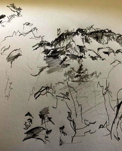 A detailed and expressive black and white illustration, featuring an intricate mountain landscape with various trees and a sense of depth. This artwork captures the natural beauty of nature with a touch of fantasy.