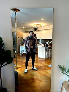 A young adult male taking a mirror selfie in a gym or personal training area, showing off his physique and tattoos. The photo captures his confident posture with a casual yet stylish attire.