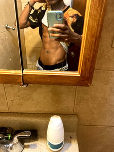 Alexander Blue, a fitness model from Connecticut, takes a mirror selfie in his bathroom to showcase his toned abs. His physique reflects the dedication and commitment to his health and wellness regimen. This image captures a candid moment that speaks volumes about Alexander's lifestyle.