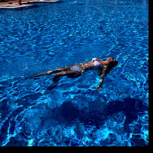 A person is seen on a boat, wearing a blue bikini and drying off with their hair. They are looking out towards the water. The model appears to be Alexandra.