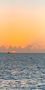 Beautiful sunset on the ocean, with a silhouette of trees and a boat in the distance. A peaceful scene that captures the tranquility of nature. โโ๏ธ๐ ๐ฃ