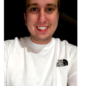 A happy individual wearing a casual white t-shirt, featuring the brand's logo. He is holding the photo and appears to be at home, possibly sharing his favorite clothing item.