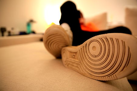 A man lounges comfortably in a living room, with white sneakers resting over some cash. His relaxed posture suggests a casual atmosphere. OnlyFans model Alex De Santis is captured in this candid moment.
