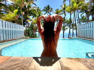 Alexis enjoying a sunny day on a rooftop poolside, radiating positive energy with a swimsuit and sunglasses. OnlyFans exclusive content. ๐ดโ๏ธ๐บ