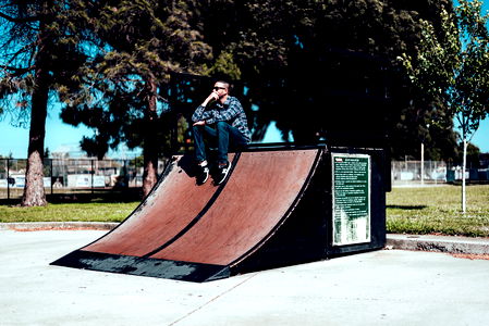 The image depicts a man sitting on a skateboard ramp, likely taking a break from riding. He is casually dressed in a plaid shirt, jeans, and sneakers, and appears to be in a park or similar outdoor area.