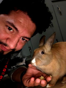 A person is seen wearing a face mask with a character or mascot motif, likely for entertainment or promotional purposes. The setting suggests this could be a photo taken during the COVID-19 pandemic as an unconventional way of social interaction.