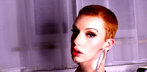 This is a model photo featuring Alexisโข. The individual has blonde hair and is wearing makeup with shimmering eye shadow. They are looking directly at the camera with a neutral expression. The background suggests a casual setting, possibly for a photoshoot. Alexisโข is based in Germany and is likely to be engaged in various modeling activities.