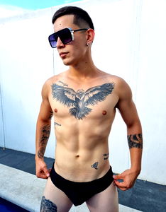 Alexis Bayonna is a fitness model and influencer based in Cรบcuta, Colombia. He is known for his muscular physique and dedication to health and fitness. In this photo, he is showcasing his well-defined abs and tattoos, wearing only swimming trunks. The image captures his confident personality as he poses poolside.