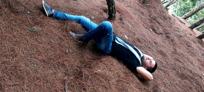 A person enjoying a peaceful moment by the water, with mountains in the background and clouds above.