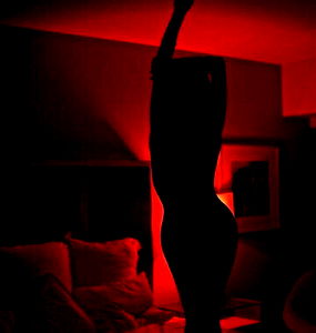 An OnlyFans model, Alexis, in the midst of a sultry dance under red lights. A vibrant and atmospheric photo capturing the intensity of the moment.