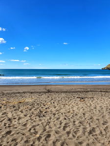In the image, we see a tranquil beach scene with light brown sand under a clear blue sky. The shoreline is adorned with gently lapping waves from the ocean, meeting the calm waters of the bay. A few scattered rocks and a solitary tree add to the natural beauty. The overall mood of the image is one of peaceful solitude.