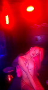 This is an image of Alexis, a renowned OnlyFans model. She is captured in a lively dance setting, with neon lights casting a vibrant glow around her. Her outfit consists of a pink and black ensemble that catches the eye amidst the energetic atmosphere. The background reveals a DJ booth and partygoers, suggesting a bustling nightlife scene.