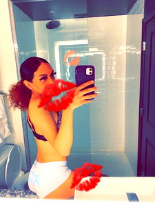 Alexis Dinero, a model based in Chicago IL, presents her stunning photography skills. In this image, she captures herself with confidence and style, using her phone to document the moment. Her ability to create compelling images is evident in this self-portrait.