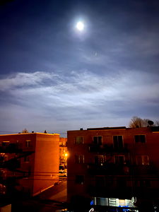 An evening view of a cityscape under the glow of a full moon. Trees and houses bathed in soft light, with a hint of haze adding to the atmospheric effect.