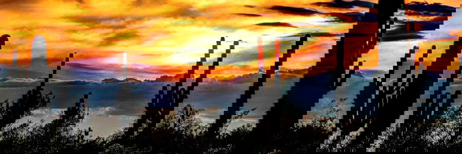 A tranquil scene capturing the breathtaking beauty of a sunset behind towering cacti, set against a backdrop of a clear sky. This image evokes a sense of serenity and the vast expanse of nature.