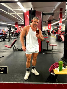 In the mirror, a man is seen posing flexed at the gym. He's wearing an unbuttoned white tank top and has short hair. In the background, a fitness machine and weights can be seen, indicating that he's in a workout area. The photo seems to capture a moment of accomplishment or preparation for a workout session.