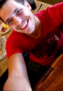 A smiling man in a red shirt taking a selfie at a dining table. He is standing in front of a menu and a plate with food. A dining area with chairs and tables can be seen behind him.