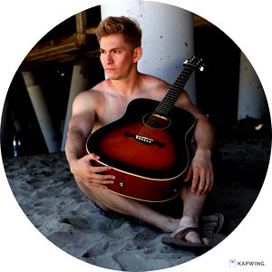 The image features a young adult male with blonde hair and a casual, laid-back style. He is sitting on the sand, holding a red acoustic guitar across his lap. His relaxed posture and the beach setting create a peaceful and serene atmosphere. The guitar he's playing has a rich, reddish tone that stands out against the natural backdrop.