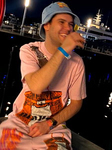 In the image, a young man is seated outdoors during nighttime. He has on a pink t-shirt with an intricate graphic design and a white bucket hat. His pose is relaxed as he smiles broadly, engaging with someone or something not visible in the frame. The lighting suggests it could be a social gathering at a restaurant or bar with neon lights in the background. A body of water is also present, which adds to the ambiance of the scene.