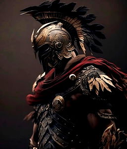 An ancient Roman gladiator, captured with detailed armor and an intense gaze.