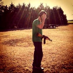 A fan-favorite model, Alex Slack, stands outdoors with a rifle. He is casually dressed in jeans and a green shirt. His stance suggests he's ready to take on an adventure or perhaps he's part of a photoshoot for his fans.