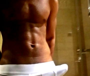 In this image, the shirtless model is captured from a high angle in a bathroom setting. He is showcasing his athletic build and flexing for the camera. This kind of image would typically be associated with fitness, body positivity, or personal photography.