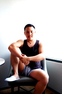 In the image, Alex Wong is captured in a relaxed moment. He's seated on a chair at what appears to be a cafe or restaurant, wearing casual attire consisting of a black tank top and shorts. His arms are crossed over his legs, and he's looking directly into the camera with a friendly smile on his face. The background is blurred but suggests an indoor setting with natural light. Alex Wong seems approachable and comfortable in this environment.