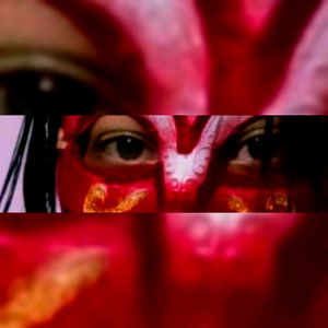The image showcases a person wearing a vibrant mask painted in red and gold. The mask appears to cover the entire face, leaving only the eyes visible. It's a striking piece of art that seems to tell a story through its colorful design. Onlyfans Alexa Kashmir appears to be the creator of this intriguing artwork.