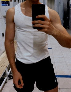 AleXXX is a young male fitness model, known for his athletic build and dedication to health. In this image, he is in the gym, taking a selfie with his phone. The gym itself appears well-equipped, suggesting a serious commitment to fitness.