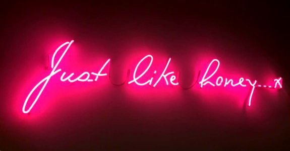 A handmade, neon sign with a fun, pink message that reads 'Just like honey, xx.' The sign is placed on top of a pink surface and features a casual yet stylish aesthetic. It's an appealing decor piece for anyone who loves to add a touch of humor and modern flair to their living space.