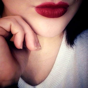 A vibrant look featuring dramatic red lips, accentuated by a dark eye shadow. The model is wearing red lipstick, which adds a pop of color to her appearance.