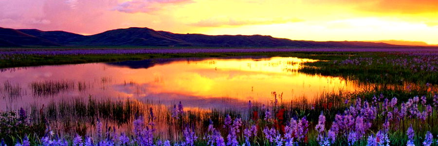 Experience the breathtaking beauty of a mountain lake at sunset, featuring an algae bloom that paints the water in vibrant hues. The image captures the stunning transition between day and night, as the sky transitions from warm oranges to deep purples over the tranquil water.