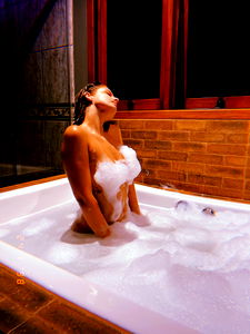 In this image, Alessandra Zambelli is seen in a relaxed setting, taking a soak in a bathtub. Her sultry gaze and the bubbles around her create an intimate atmosphere. The dim lighting adds to the moodiness of the scene. In the background, there's a large window letting in natural light, suggesting she might be enjoying some quiet alone time after a long day or during a steamy bubble bath.