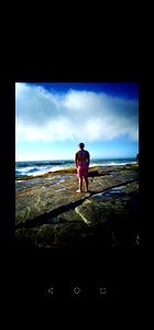 An urban streetwear model posing on a coastal stone jetty with a backdrop of a beautiful sunset over the ocean. The setting sun casts warm hues across the scene, highlighting the textures and colors of the surrounding environment.