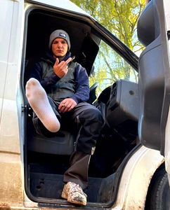 A young man is sitting inside a work van, wearing a black beanie and a white tee-shirt. He's holding up his middle finger while making an intense face. The van is parked outdoors with trees and blue sky in the background.