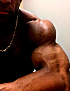 Alfarionix, a professional fitness model, demonstrates his incredible bicep muscles. His dedicated workout routine has led to impressive muscle definition and size.