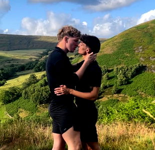 This image captures a tender moment between two OnlyFans models, Alfie and Chase. They are standing on top of a hill with lush greenery around them. The focus is on their embrace as they share a kiss under the clear blue sky.
