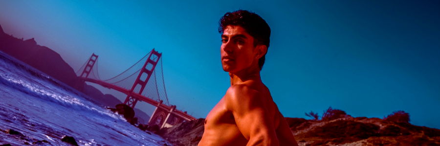 A fit young man from San Francisco poses confidently at the beach with a Golden Gate Bridge view, showcasing his athletic build and sunlit physique.