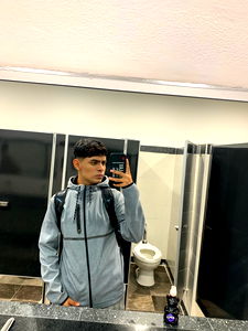 A photo of Alfredo Montiel, a young adult male from Ciudad de Mexico. He is standing in a restroom, holding a smartphone, with a backpack on. He appears to be indoors, as suggested by the bathroom stall and the visible sink and mirror.