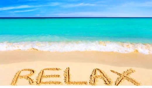 A serene beach scene with 'RELAX' written in sand, emphasizing tranquility and leisure. This image can be used for promotional material for relaxation retreats or as part of a travel blog.