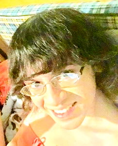 The image features a person with glasses smiling at the camera. The individual has short hair and is wearing a top that suggests a casual or comfortable setting, possibly at home.
