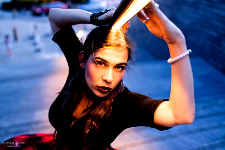 Striking black and white model photoshoot, featuring the alluring Aliana Angel in a dynamic pose with dramatic lighting. Taken at an outdoor location.