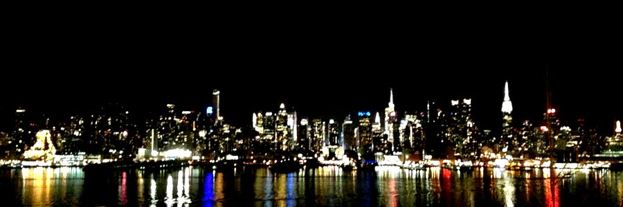 A captivating nighttime view of the iconic skyline of New York City from a distance, with boats in the water and a clear night sky. Alyssa Jayne George, a model from NewJersey.