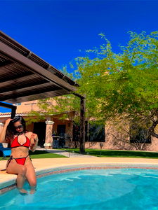 Stunning OnlyFans model Ali.miau poses confidently in a lively bikini set, highlighting her physique and fashion sense. She is seen taking a selfie with her phone, perhaps capturing memories of her photoshoot or just showcasing her style.