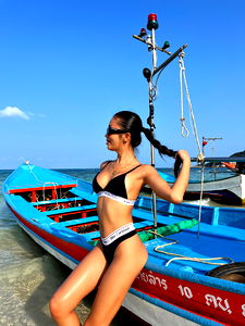 A young woman poses confidently at a vibrant beachfront, with her hand casually resting on the boat railing. She is wearing a bikini and sunglasses, radiating the warmth of the sun and sand.