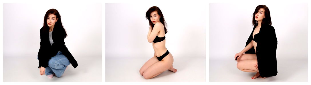 Alice Charm, a model photoshoot in a studio setting. Alice is posing confidently against a white background. She's wearing casual attire and has a thoughtful expression.